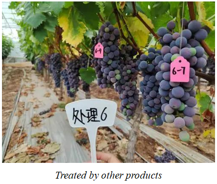 The following is a field comparison between Coronatine and other products for improving the color of grapes:1) Location: Yunnan Province, China2) Grape variety: Xiahei3) Treatment time and method: March 20, 2021, by foliar spray