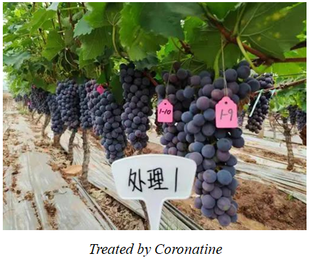 On March 28, 2021 (eight days after the treatment), the color of the grapes treated with Coronatine deepen and even out in color, while the fruit powder on the grape skin is thick.The photos are below: