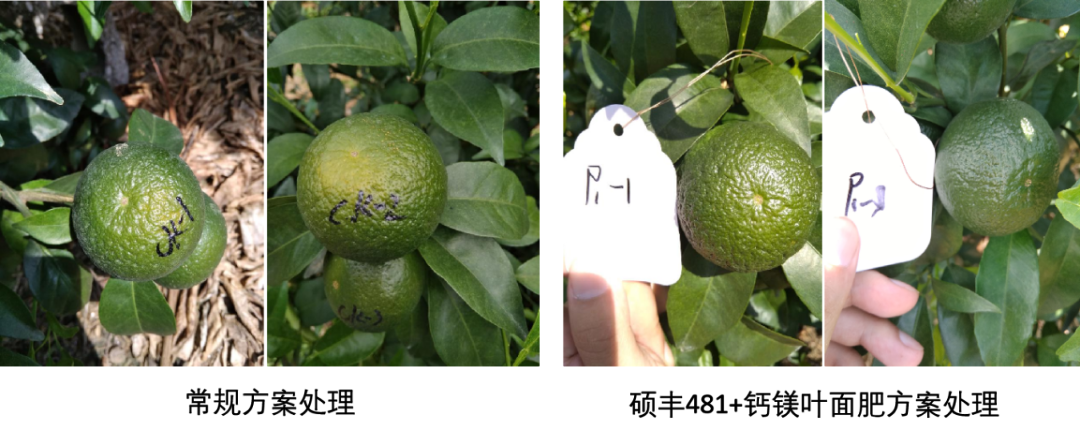 在雜柑的幼果膨大期使用天然蕓苔素+鈣鎂葉面肥能夠促進(jìn)樹體補(bǔ)充鈣元素,果面光靚,減少裂果產(chǎn)生,預(yù)防日灼果。小編推薦:雜柑幼果膨大期,使用天然蕓苔素碩豐481?2000倍+多迎鈣鎂1000倍噴霧。與常規(guī)方案處理相比,此方案處理,果實(shí)直徑大、果面光亮,日灼果發(fā)生概率降低30%。